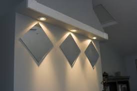 The use of lighting can add to or subtract from the overall colors of a room or from only those surfaces the light is meant to enhance. Darker colors make a room feel smaller and cramped, while light-colored walls do the opposite. The illusion of space is defined by light reflected off of the surfaces of the walls. Some types of lighting help with this illusion by further illuminating the walls. In addition, directional lighting, such as a track light, can soften the wall colors. There is also recessed can lighting, which has a soft, downward glow that illuminates the floors, not walls. This is opposed to lights hung from the center of the room, which provide ambient illumination, or wall lighting. In both cases, this can affect how light or dark a colored section can appear.Directional Lighting